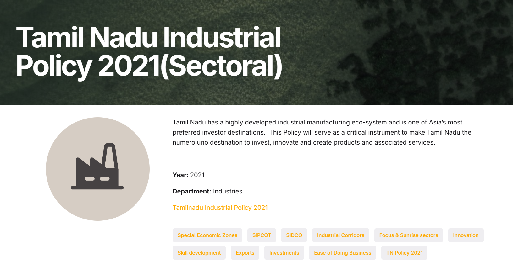 Access comprehensive information on Tamil Nadu's investment ecosystem through Invest India's official state portal.