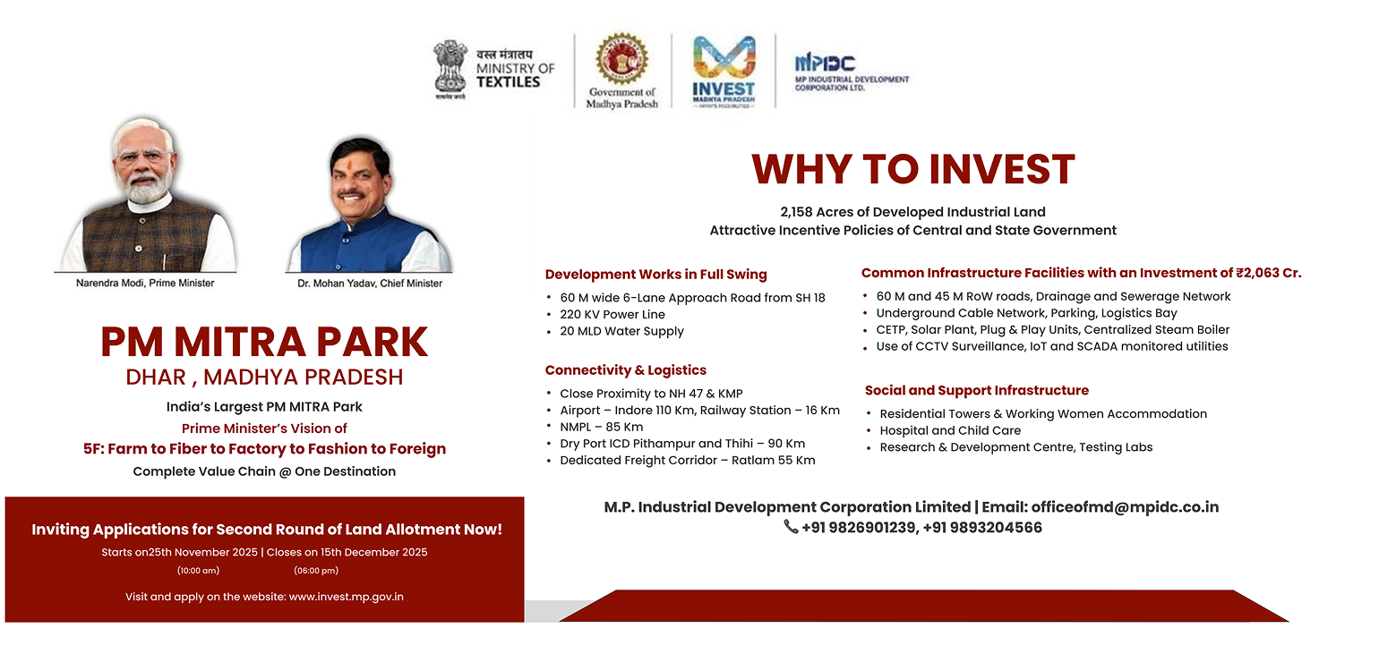 Dhar, Madhya Pradesh hosts a ~2,100-acre PM MITRA Mega Textile Park with strong cotton availability, integrated textile infrastructure, and excellent road–rail connectivity.