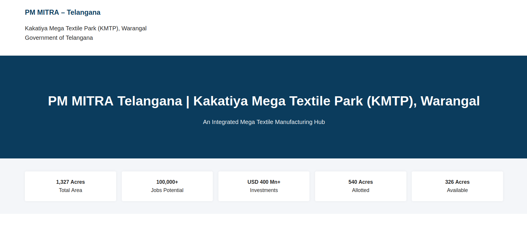 तेलंगाना के वारंगल में लगभग 1,327 एकड़ में फैला पीएम मित्र मेगा टेक्सटाइल पार्क है, जिसमें एकीकृत कपड़ा अवसंरचना, ₹3,862 करोड़ से अधिक का नियोजित निवेश और स्थानीय कच्चे माल और मजबूत कनेक्टिविटी का लाभ उठाते हुए लगभग 24,400 नौकरियां सृजित करने की क्ष